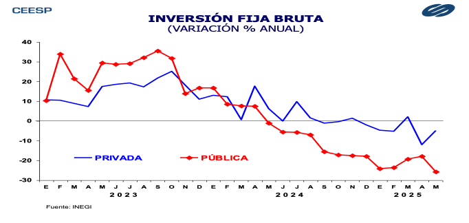 En el tema del debilitamiento de la inversión, un factor relevante es la caída de la inversión pública que, con base en cifras originales, en mayo registró una disminución anual de 25.8%, con lo que acumuló trece meses consecutivos a la baja. Es evidente que el reducido gasto del gobierno en infraestructura inhibe la inversión privada.
