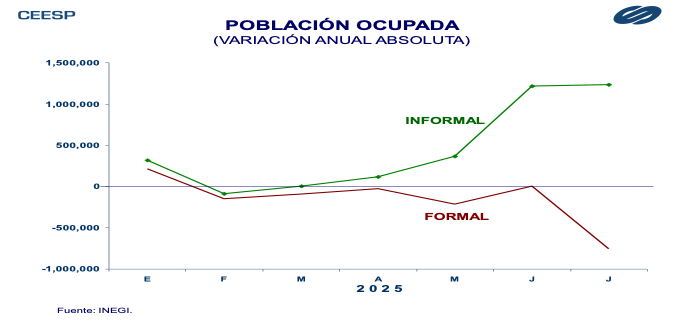 En julio la población ocupada del país sumó 60,802,157 personas, lo que significó un aumento de 475,168 respecto al mismo mes del año pasado. En términos relativos esto representó un aumento anual de 0.8%, después de que un mes antes mostrara un avance de 1.2%. No obstante, el mercado laboral sigue dando señales de precarización. El aumento en la población ocupada se integró de una disminución de 757,376, personas en la formalidad, en tanto que la informalidad aumentó en 1,232,544 personas. Esto propició que la tasa de informalidad laboral se elevara de 54.5% en julio de 2024 a 56.1% en el mismo mes del presente año. Por nivel de ingreso, en julio la población ocupada que percibe hasta dos salarios mínimos representó el 68.9% del total, mientras que los que perciben más de dos salarios mínimos representaron solo el 8.9%, porcentajes que contrastan con el 43.2% y 35.5%, respectivamente, que se observaron en igual mes del 2018.