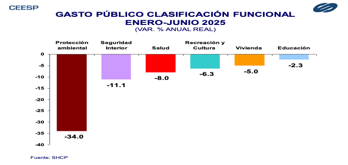 Por el lado de su clasificación funcional, que detalla hacia donde se canalizan los recursos, se aprecian importantes ajustes a la baja. Mientras que el gasto en protección ambiental se redujo 34.0% anual, el destinado a seguridad interior lo hizo en 11.1%, el destinado a salud en 8% y el canalizado a educación en 2.3%.
