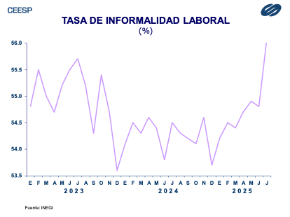 La informalidad es otro factor que además de reflejar la complejidad que tienen las empresas para generar empleos formales, refleja mayores niveles de precarización del empleo. La información del INEGI indica que, del aumento total anual de la población ocupada en julio, el total de quienes laboran en la formalidad se redujo en 757 mil personas, mientras que quienes se ubicaron en la informalidad aumentaron en 1.2 millones de personas. Esto significó que la tasa de informalidad laboral aumentara de 54.5% en julio del año pasado a 56.1% en el mismo mes del presente año.