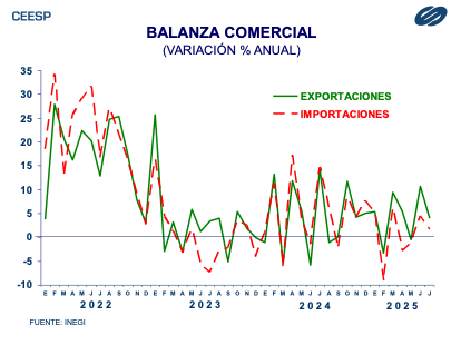 A pesar de los efectos de la política comercial de los Estados Unidos, la actividad comercial de México se mantiene al alza. Durante julio el valor total de las exportaciones ascendió a 56,708 millones de dólares, lo que significó un incremento anual de 4.0%. A su interior, las exportaciones petroleras cayeron 23.0%, respondiendo a la disminución, tanto del precio como de la plataforma de exportación de crudo. Las exportaciones no petroleras aumentaron 5.2%, impulsadas por un alza de 22.2% en las extractivas y un aumento de 5.3% en las manufactureras, dentro de las cuales las automotrices cayeron 7.0%, en tanto que el resto de las exportaciones manufactureras crecieron 11.7%. Por su parte, en julio el valor total de las importaciones de mercancías fue de 56,725 millones de dólares, lo que representó un avance anual de 1.7%.