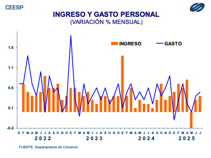 El Departamento de Comercio también informó que durante julio el ingreso personal aumentó 0.4%, en línea con la estimación del mercado. Este comportamiento respondió principalmente al incremento de 0.6% en los sueldos y salarios. Por su parte, el gasto personal se elevó 0.5%, también en línea con lo anticipado por el mercado.