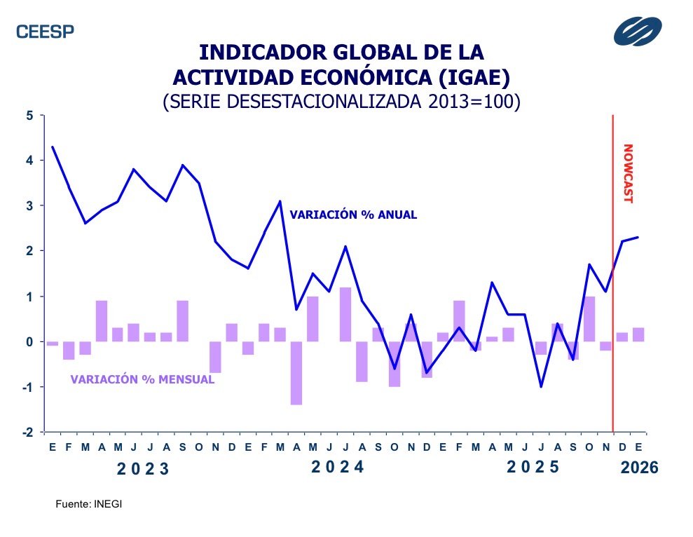 Tras un mejor desempeño de la actividad productiva en los últimos meses del 2025, la estimación oportuna del INEGI señala que durante diciembre la actividad económica tuvo un aumento mensual de 0.2% y un avance de 0.3% durante enero, de tal manera que en su comparación anual esto significa avances de 2.2% y 2.3% para diciembre y enero.