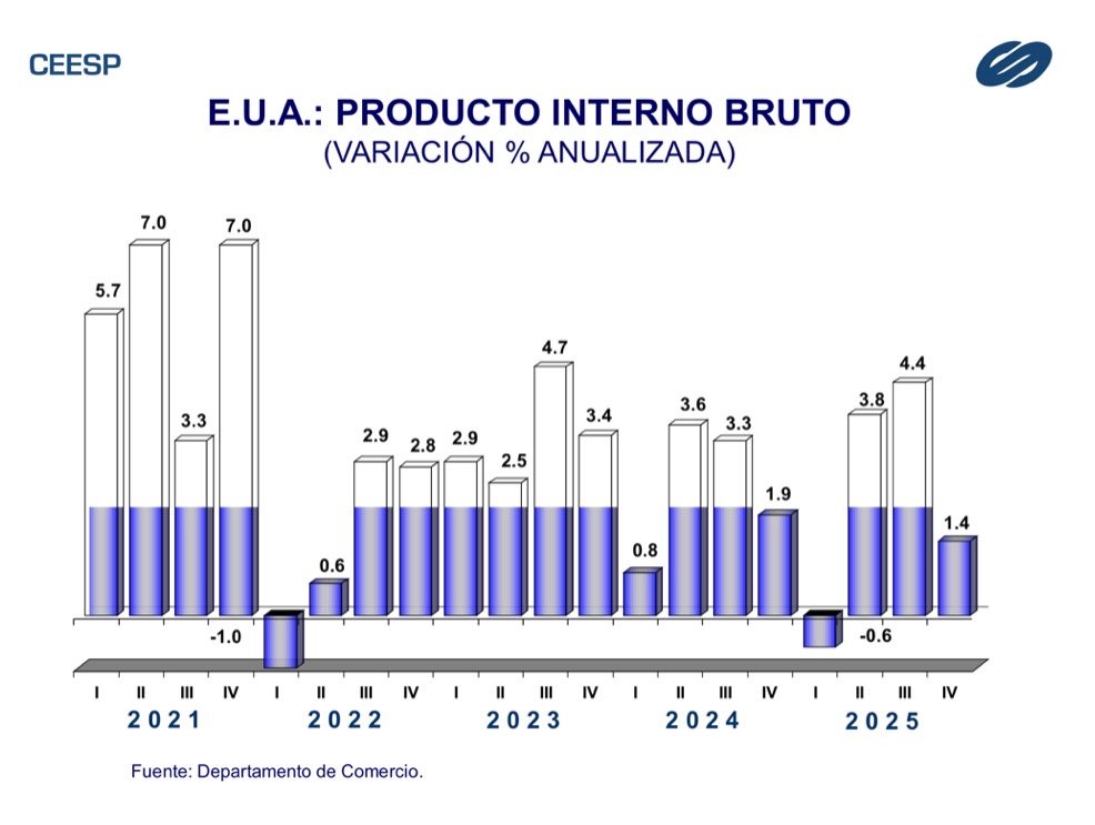 De acuerdo con la primera estimación del Departamento de Comercio, durante el cuarto trimestre del 2025 el PIB creció 1.4%, muy por debajo de la estimación el mercado que anticipaba un avance de 3.0%. Al interior de los componentes del PIB, el gasto en consumo personal aumentó un 2.4%, frente al 3.5% del tercer trimestre. Por su parte, la inversión privada aumentó 3.8%, después de que un trimestre antes se mantuviese sin cambio. Las exportaciones disminuyeron 0.9%, después de que en el tercer trimestre se incrementaran 9.6%. Las importaciones, por su parte, cayeron 1.3%. En el caso del gasto público, en el cuarto trimestre del 2025 se observó una disminución de 5.1%.