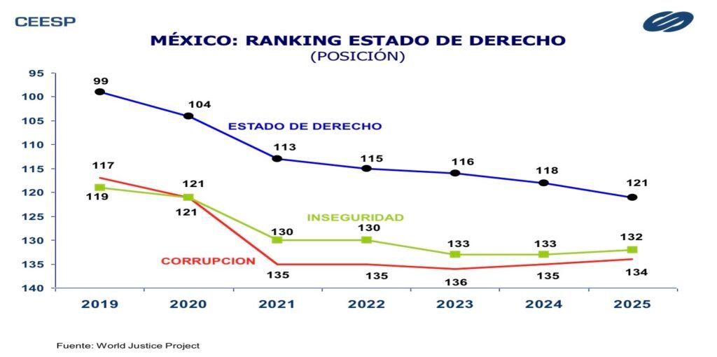 En los últimos años, los niveles de confianza se han debilitado significativamente, de tal manera que México ha perdido terreno en el ranking mundial en esta materia. Si bien ya se ubicaba en un lugar bajo de la tabla mundial, en 2025 se acercó más al fondo de la clasificación. Tan solo en materia de corrupción, se ubicó en el lugar 134 de un total de 143 países, 17 lugares menos que en 2019.