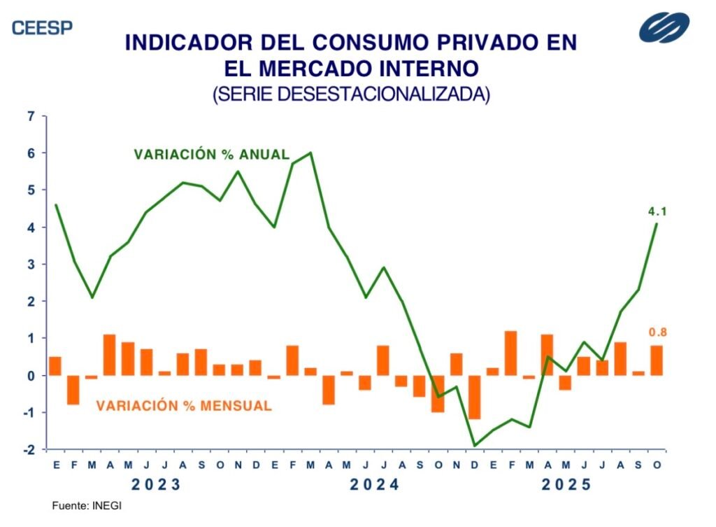 La evolución del gasto que realizan los hogares en bienes y servicios de consumo comienza a mostrar señales de un mejor desempeño a finales del 2025. Los resultados del INEGI muestran que en octubre pasado el Indicador Mensual del Consumo Privado (IMCP) reportó un alza mensual de 0.8%, superando significativamente su estimación oportuna que anticipaba un avance de 0.3%. De esta manera, en su comparación anual se aprecia un incremento de 4.1%. Sin embargo, la estimación oportuna del INEGI anticipa que en noviembre el consumo privado regresará a terreno negativo puesto que se prevé una caída mensual de 0.1%.