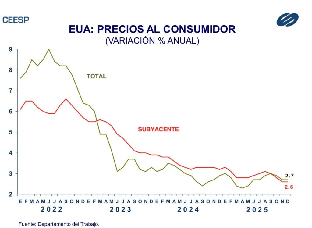 El Departamento del Trabajo informó que durante diciembre los precios al consumidor registraron un alza de 0.3%, en línea con la expectativa del mercado, pero ligeramente superior al aumento de 0.2% en noviembre. De esta manera, en su comparación anual los precios al consumidor aumentaron 2.7%. Excluyendo alimentos y combustibles, el indicador de precios subyacente reportó un incremento mensual de 0.2%, de tal manera que en comparación con el mismo mes del año pasado tuvieron un aumento de 2.6%.