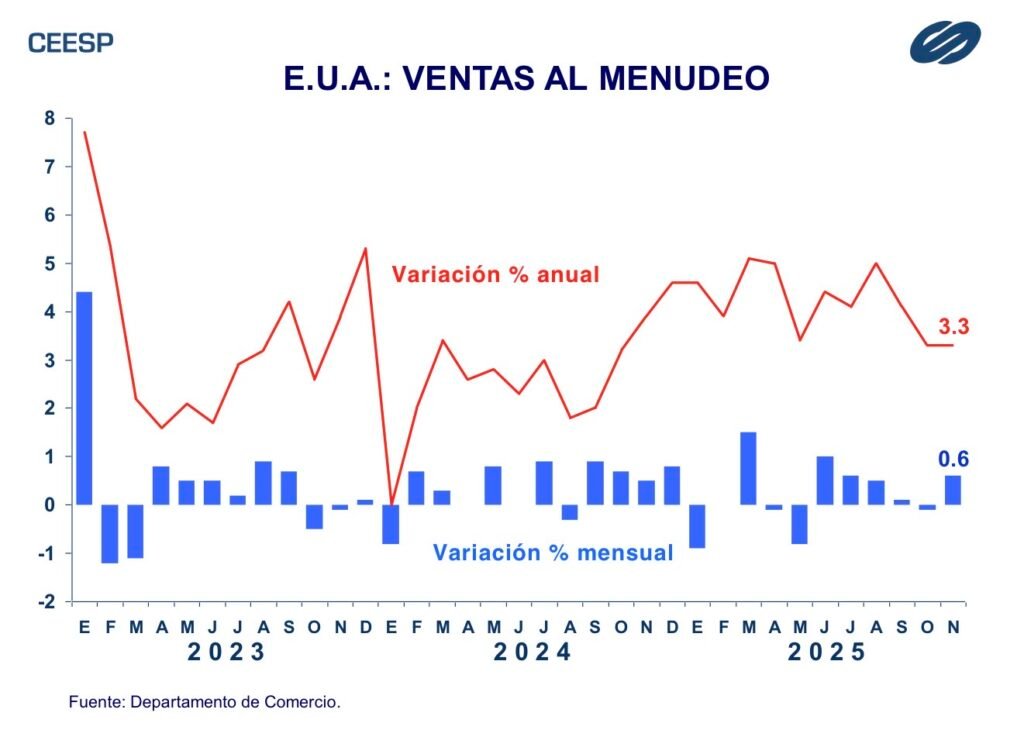 De acuerdo con el reporte del Departamento de Comercio, durante noviembre las ventas al menudo tuvieron un incremento de 0.6%, superando la expectativa del mercado que preveía un alza de 0.4% y el resultado del mes previo que mostró una disminución de 0.1%. Durante el mes las ventas de concesionarios de vehículos de motor y autopartes aumentaron 1.0%, en tanto que las ventas en gasolineras se elevaron 1.4%. En el caso de las ventas en tiendas de ropa y accesorios se observó un aumento de 0.9%.