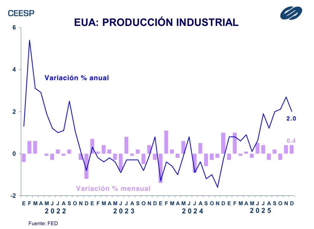 La Reserva Federal reportó que durante diciembre la producción industrial creció 0.4%, superando el pronóstico del mercado que anticipaba un incremento de 0.2%, y similar al avance registrado un mes antes. En su comparación anual la producción anual creció 2.0%. A su interior, la producción manufacturera aumentó 0.2% después de un alza de 0.3% un mes antes. La producción de servicios públicos creció 2.6% mensual, lo que significó un incremento anual de 2.3%. En el caso de la producción minera se reportó una disminución mensual de 0.7%, aunque en términos anuales tuvo un avance de 1.7%.