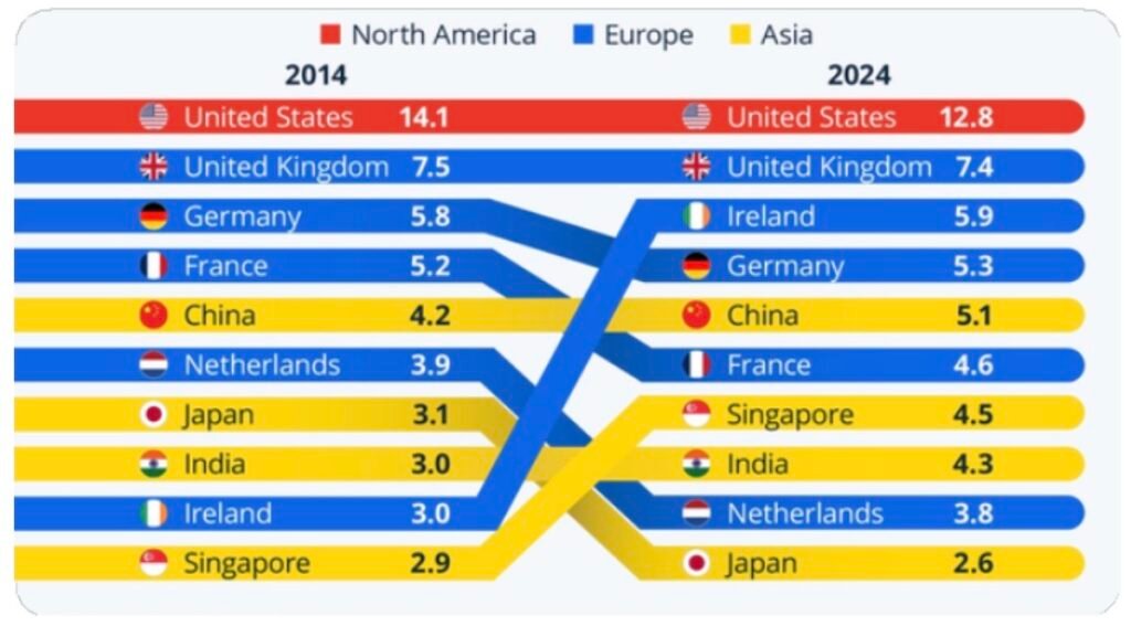 Según un comparativo publicado por la OMC esta semana, EE.UU. y Reino Unido se mantuvieron como los principales exportadores de servicios en 2024, en comparación con 2014, con 12.8% y 7.4% del total global respectivamente. Irlanda (5.9%) escaló al tercer lugar, seguida de Alemania (5.3%) y China (5.1%), mientras Francia (4.6%), Singapur (4.5%), India (4.3%), Países Bajos (3.8%) y Japón (2.6%) completan los primeros 10 lugares a nivel mundial.