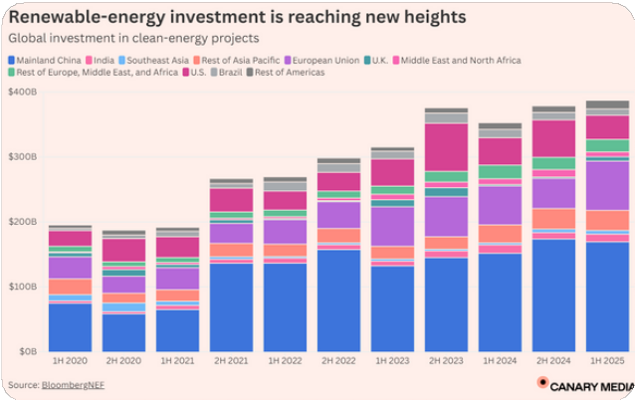 La inversión mundial en energías renovables alcanzó un récord de 386 mil millones de dólares en el primer semestre de 2025, un aumento del 10% respecto al año anterior. Sin embargo, en EE.UU. cayó 12%, en contraste, la UE registró un aumento del 27%, China duplicó su inversión en energía solar y el Reino Unido triplicó su inversión, impulsados por desarrollos en el Mar del Norte.