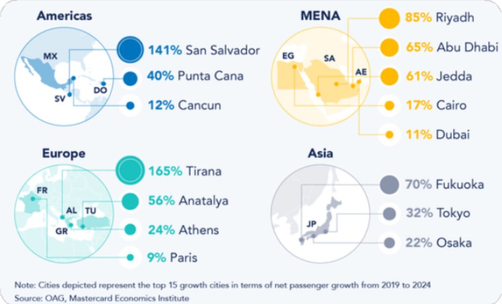 De acuerdo con la Official Aviation Guide y el Mastercard Economics Institute, desde 2019 el crecimiento del turismo internacional se ha concentrado en destinos emergentes como Tirana (+165%) en Europa, Riad (+85%) en Medio Oriente y Fukuoka (+70%) en Asia, mientras en América destaca San Salvador (+141%), y destinos consolidados como Cancún (+12%).