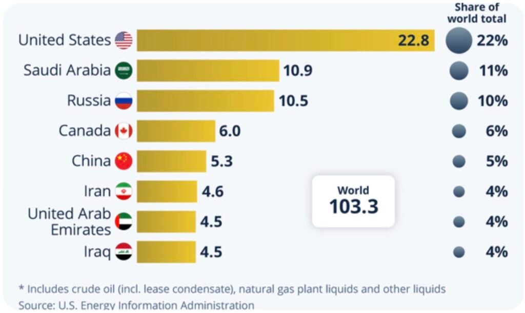 Según la Administración de Información Energética de EE.UU., en 2024 Irán fue el 6° productor mundial de petróleo con 4.6 millones de barriles diarios. Debido a las tensiones en Medio Oriente, el precio del crudo superó los 100 dólares por barril por primera vez desde 2022, ya que el estrecho de Ormuz es una ruta clave para el comercio energético global.