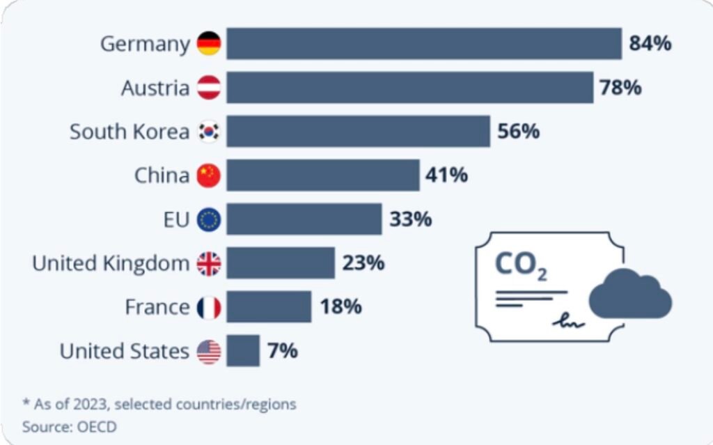 De acuerdo con un estudio de la OCDE, Alemania lidera la cobertura de emisiones con 84% bajo sistemas de comercio de carbono, seguida por Austria (78%), Corea del Sur (56%) y China (41%). En la Unión Europea el promedio fue de 33%, mientras que el Reino Unido alcanzó 23%, Francia 18% y EE.UU. solo 7%.