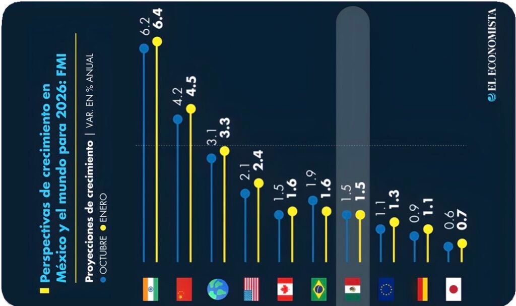 El Fondo Monetario Internacional elevó su previsión de crecimiento mundial para 2026 a 3.3%, con India (6.4%) y China (4.5%) como principales motores, mientras EE.UU. crecería 2.4% y Canadá 1.6%. Para México, el organismo mantuvo su estimación en 1.5%, en un contexto de recuperación global moderada.